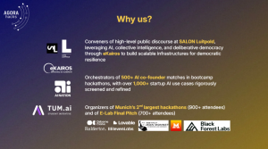 The 10.11., a compelling discussion unfolded at SALON Luitpold around the theme „Democracy in Update Mode – Between Geopolitics and Technological Innovation.“ With insights from Tina Höfinghoff (Transatlantic Hub), Josef Lentsch (Political Tech Summit), Lukas Salecker (deliberAide), and Stephan Meier (eKairos), we explored how democracies can not only endure but thrive in times of rapid change.